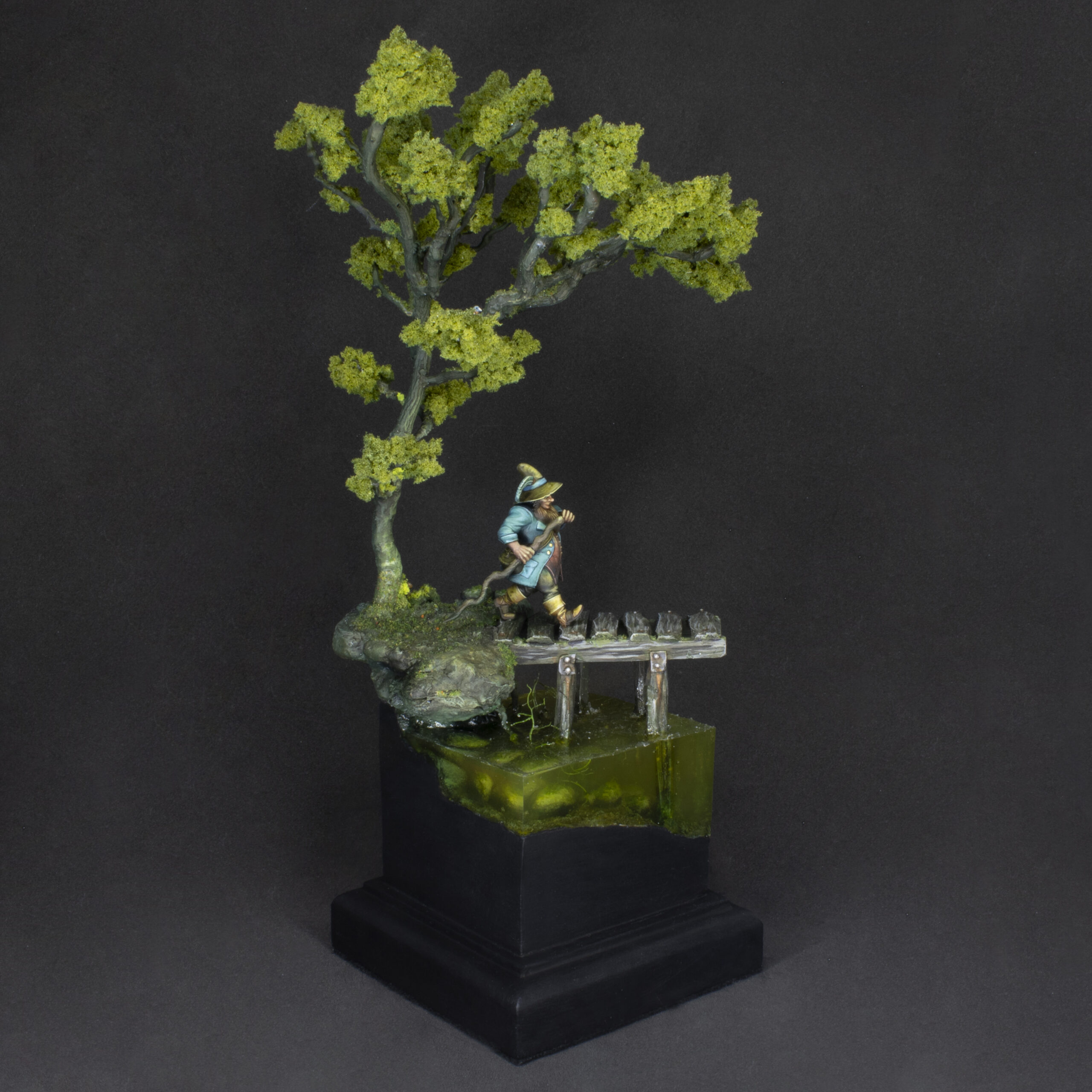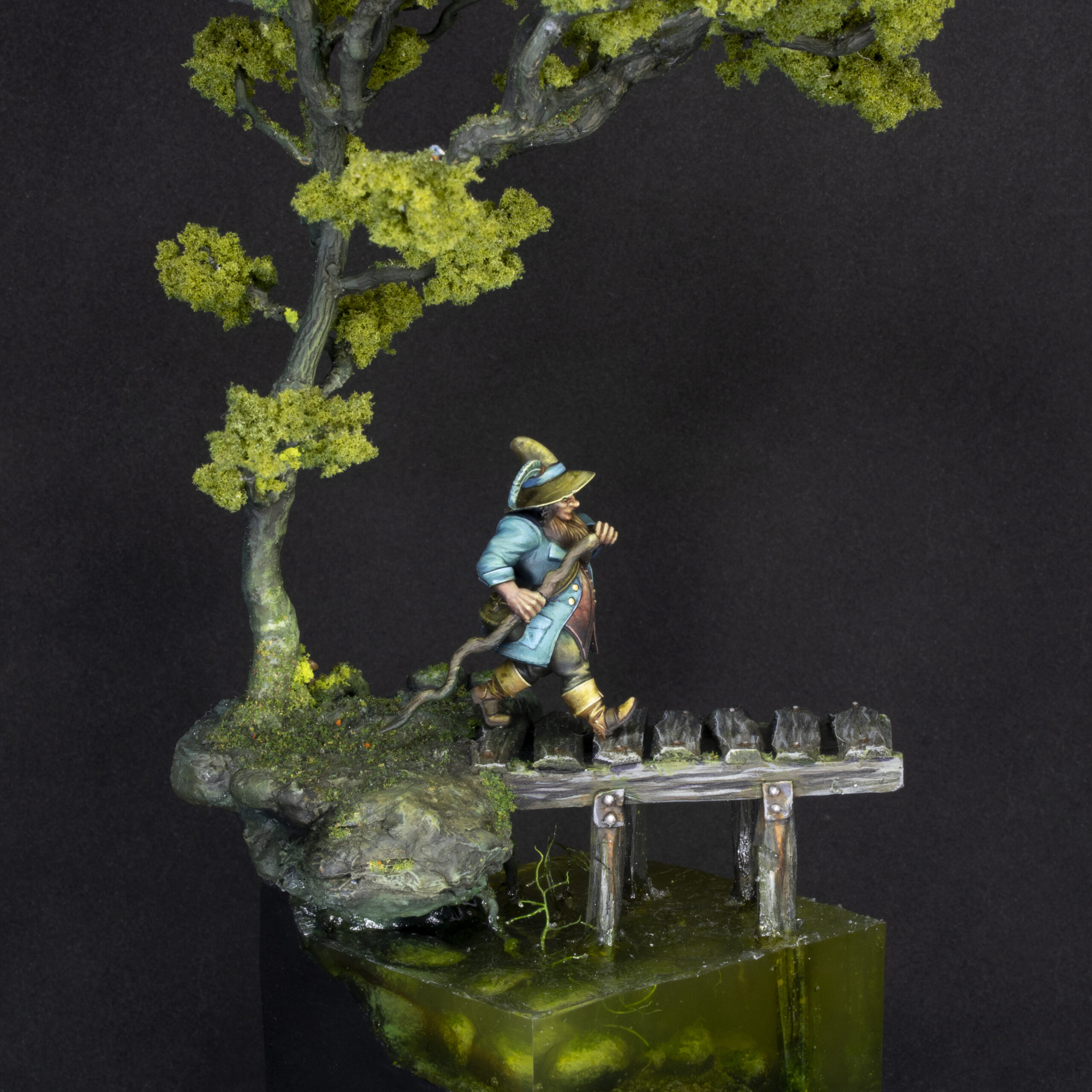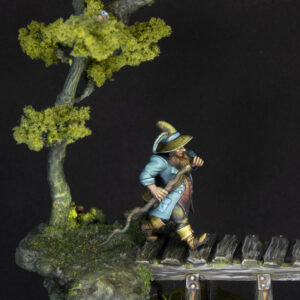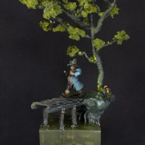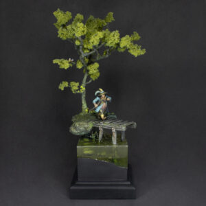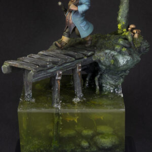 The figure has been printed in resin in a size of 32 mm. The whole diorama has been sculpted and hand built with a mix of natural and artificial elements.