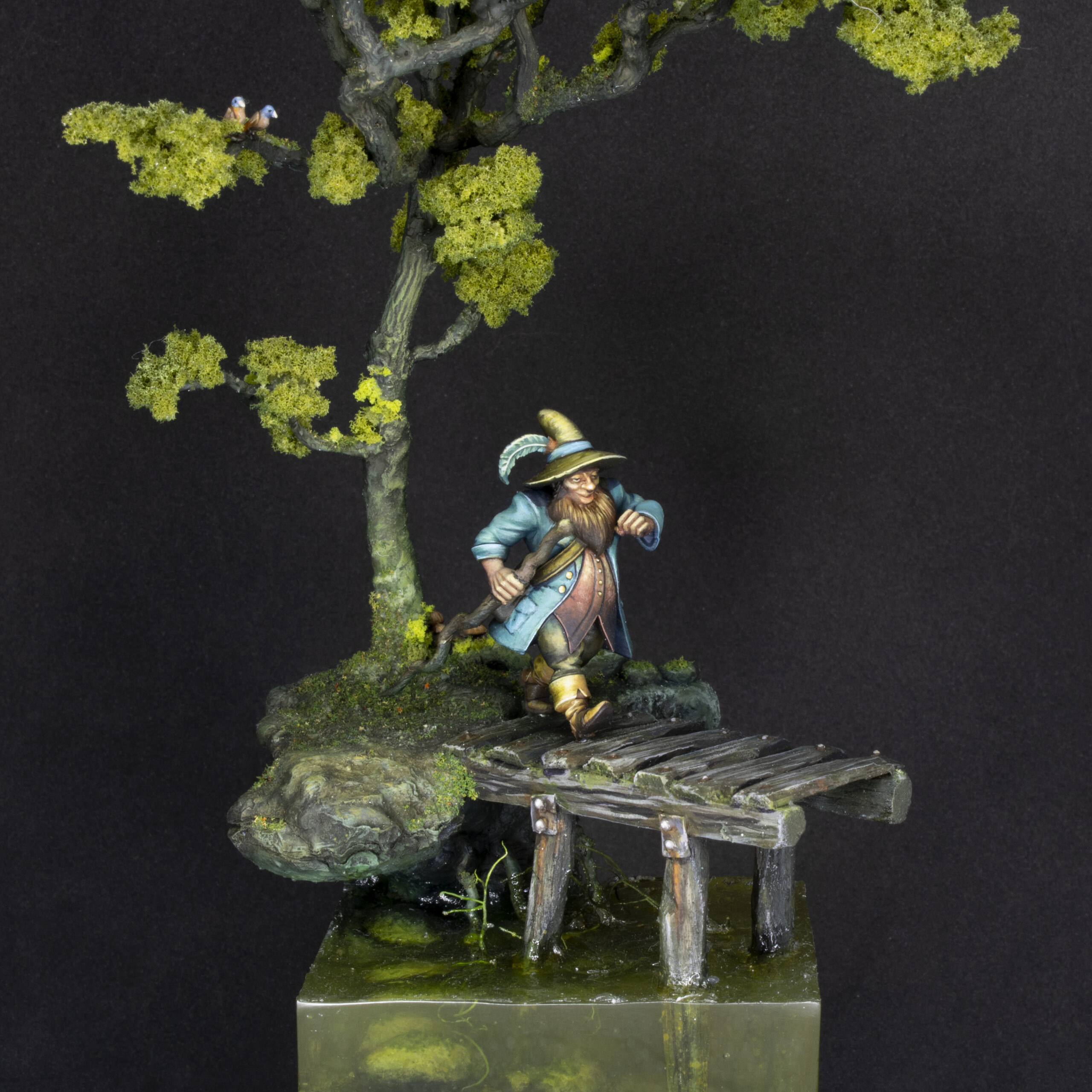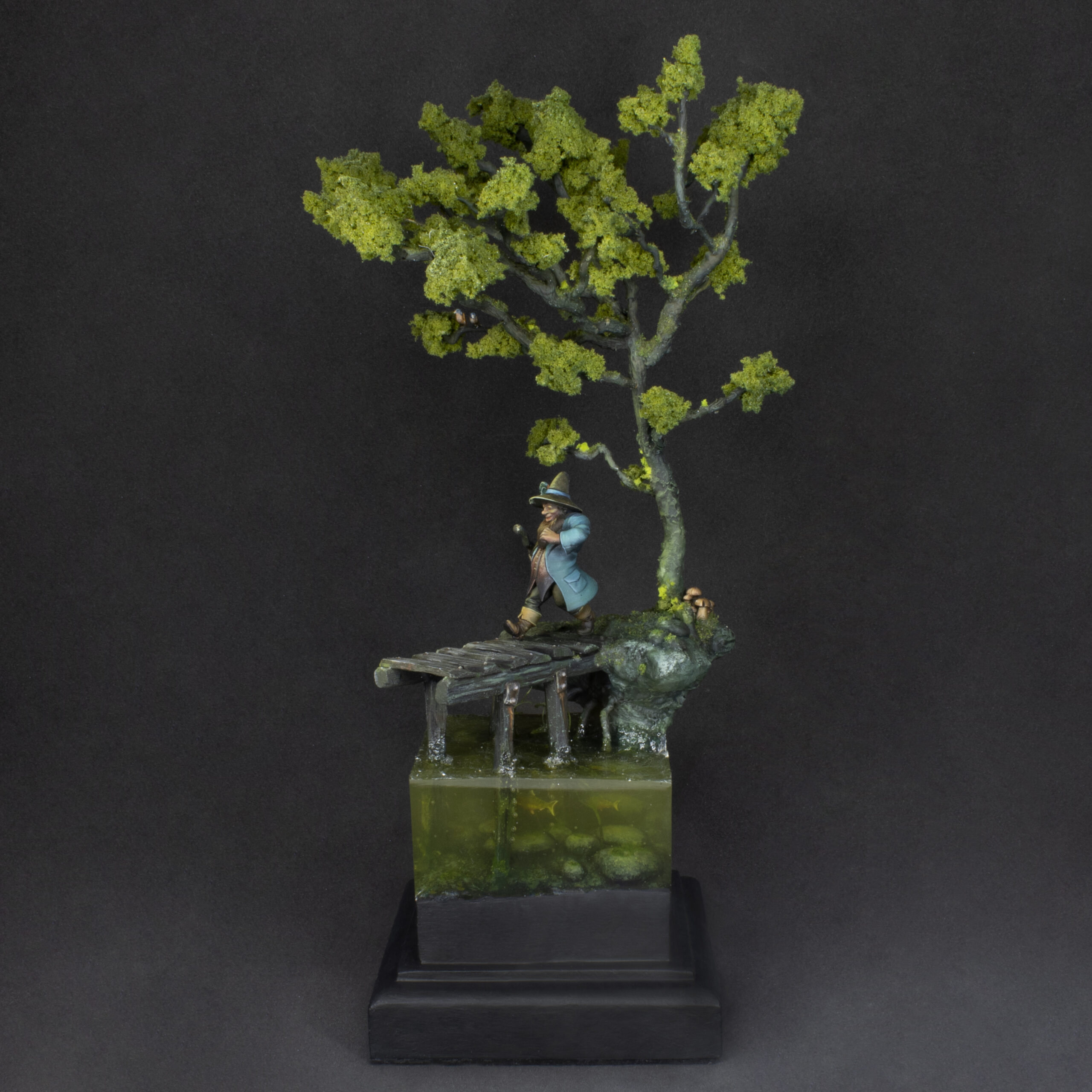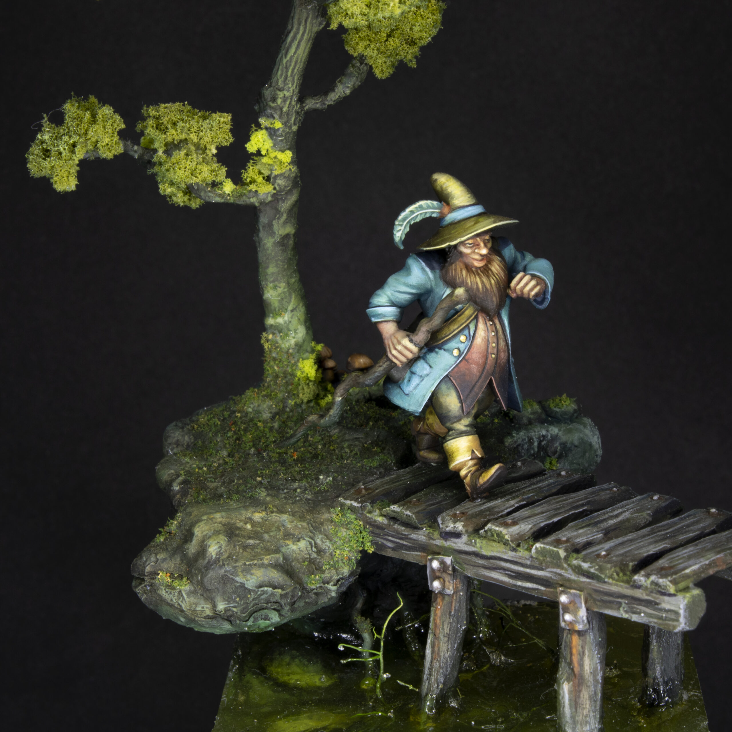 The figure has been printed in resin in a size of 32 mm. The whole diorama has been sculpted and hand built with a mix of natural and artificial elements.